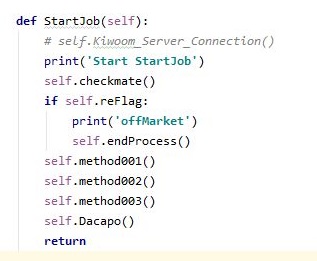 그리고 나서 연속적인 접속은 좋지 않을 것으로 생각이 되어서 일단 키움증권 서버와 연결은 자제 하도록 하고, 그 다음으로 해야 하는 것으로 일단 빈 공백 메서드를 여러개 만들어서 순서대로 실행시켜 보도록 만들어 보았습니다.