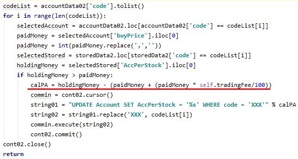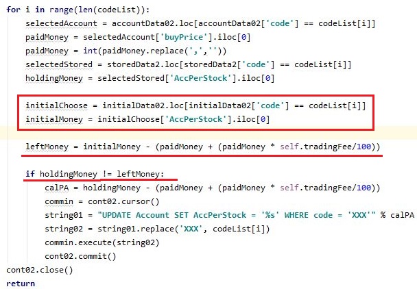 다음으로 해야 하는 것으로는 위 스크린샷에서 볼 수 있는 것처럼, 일단 관련된 데이터 베이스에서 정보를 가지고 오도록 만들어 주도록 합니다. 그리고 키움증권 서버에서 가지고 온 계좌의 내용이 0 이다 = 매수한 것이 없다는 계산이 나오면, 그냥 메서드를 종료하도록 설계합니다.