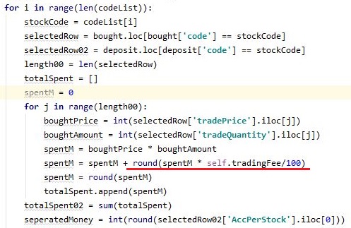 그리고 나서 다음으로 할 것은 이제 매도시에 수수료를 계산하는 단계인데, 이 단계에 들어와서는 위 스크린샷에서 볼 수 있는 것처럼 여기서도 round함수를 붙여 줍니다.