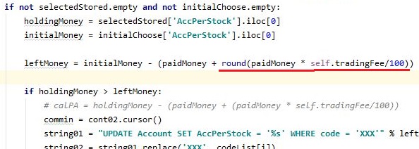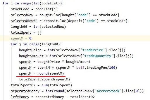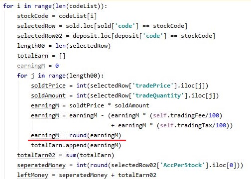 그리고 나서 다음으로 할 것은 이제 매도시에 수수료를 계산하는 단계인데, 이 단계에 들어와서는 위 스크린샷에서 볼 수 있는 것처럼 여기서도 round함수를 붙여 줍니다.