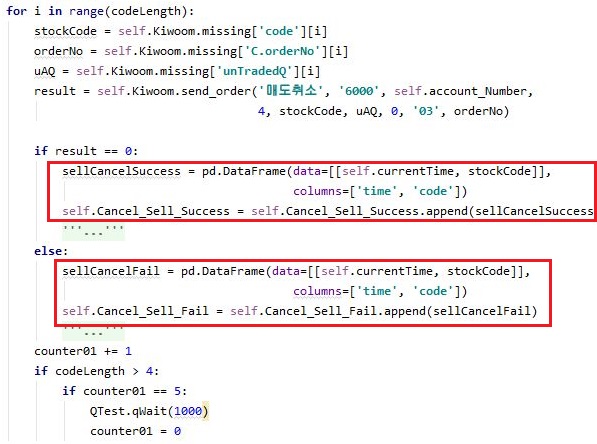 그리고 나서 매도명령을 취소하는 것이 성공인지 아닌지를 일단 데이터 베이스 파일에 일일히 담아서 나타낼 수 있도록 만들어 놓았습니다.
