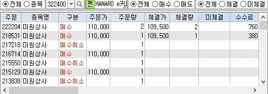 그러다가 이제서야 제대로 무언가가 되는 것인지 매수취소가 연속으로 나오는 것을 확인할 수 있었습니다. 이렇게 해서 나왔는데, 이제 다음의 작업에 들어가 봐야 합니다.