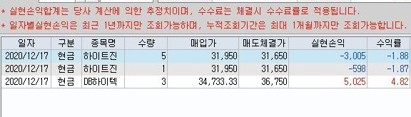 그리고나서 하이트 진호의 매도도 일어났는데, 이 경우에는 손해가 나왔습니다. 일단 매도체결가가 매입가 보다 낮아서 혹시나 이게 손절매인가 했는데, 그건 아니었습니다.