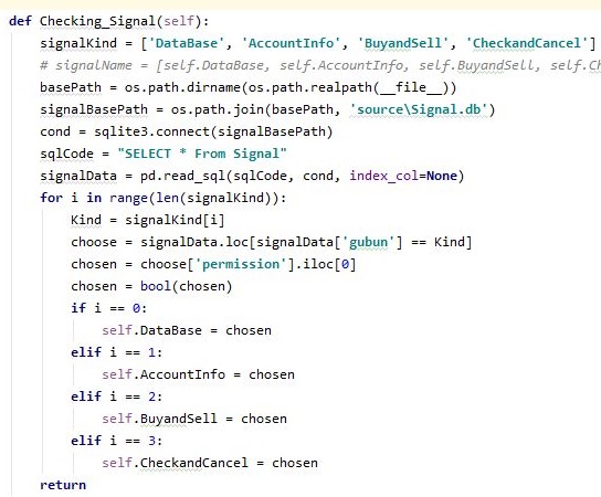 그리고 나서 새로운 메서드를 하나 만들어 주도록 하는데, 이 메서드의 의의는 바로 시작할 때 마다 이 시그널을 체크해서 어떻게 할 것인지를 만들어 주는 것 입니다.