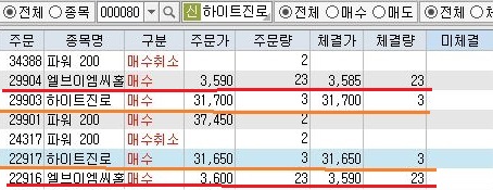 그리고 나서 다음으로 가야 하는 것으로는 일단 매수상황을 보니까, 한번 매수가 이루어진 다음에 게속해서 이런 상황이 이어지는 것을 볼 수 있는데, 이게 단순히 중간에 멈추어서 이런 것인지, 아니면 다른 곳에 있는 에러 때문인지는 잘 모릅니다.