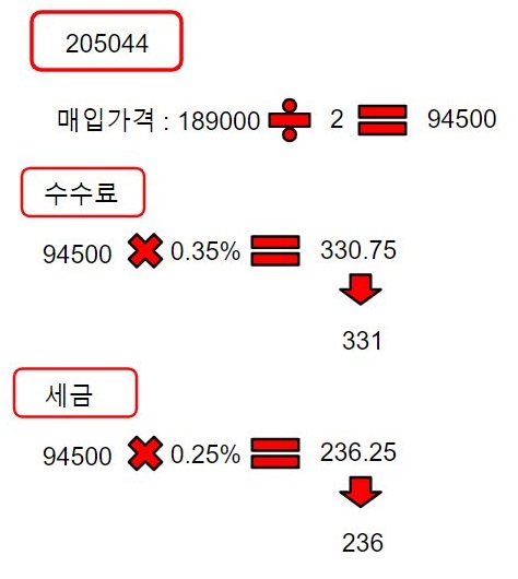 그래서 일단 저 매입가격의 절반에 해당하는 금액에 먼저 수수료와 세금을 계산해 보도록 합니다. 그리고 나서 이래저래 조합을 해보니.......