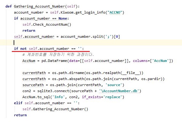 그래서 기존의 코드를 위 스크린샷과 같은 방법으로 바꾸어 보도록 했습니다. 이렇게 해서 일단 self.account_number가 공백이 아니라면 작업을 할 수 있도록 바꾸도록 했습니다.