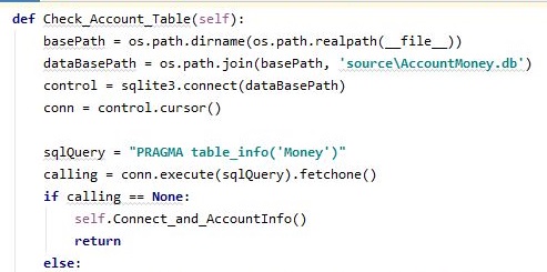 먼저 AccountMoney의 내용이 비어있는 상황이 되면, 체크해서 다시 받아오라는 내용의 메서드를 만들어 보도록 합니다. 일단 처음 머리 부분을 만들었습니다. 우선 해당하는 데이터 베이스 파일에 테이블이 있는지 여부를 체크한 다음에, 없으면 다시 받아오라고 보내는 내용을 넣었습니다.