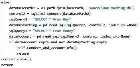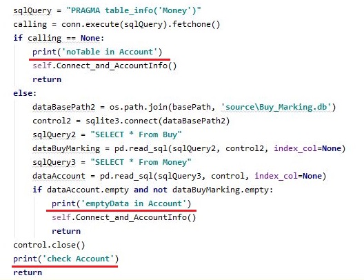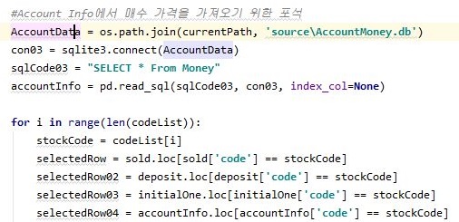 일단 이 작업을 위해서 데이터 베이스 파일인 AccountBackUp이 없으면 생성을 시키라고 하기는 했는데, 지금부터 문제는 있을 경우 입니다. 일단 기존의 AccountMoney에 있는 종목 코드를 가지고 오도록 해서 리스트로 만들어 줍니다.