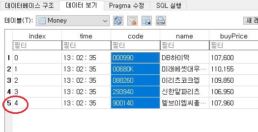 먼저 이 상황이 맞는지 체크하기 위해서 일단 Account Money라는 데이터 베이스를 열어서 계좌를 확인해 보면, 5개의 종목을 매수한 사실을 확인할 수 있습니다.