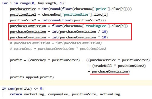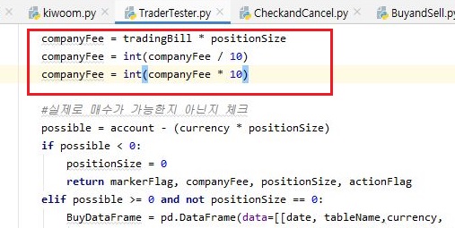 그리고 나서 이제 매도/매수를 결정해야 하는 py파일까지 와서 작업을 하게 되었습니다. 일단 여기서 하나 알 수 있는 것으로는 여기서 수수료를 10원 미만은 절사할 수 있도록 바꾸어 주는 것 입니다.