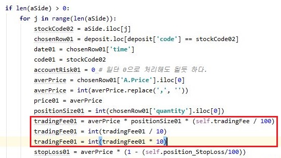 여기서 있는 tradingFee는 그냥 수수료만 있는 것이 아니라, 이미 계산이 끝난 항목이 있는 것 입니다. 그래서 다시한번 매수하고자 하는 주식의 수량에 곱할 필요는 없습니다.