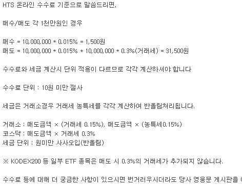 세금에 대해서는 일단........... 이렇게 보니, 어디서는 그냥 일괄적으로 0.3% 부과를 하지 않나, 어디서는 0.15%씩 두번 부과한다고 하는데, 이에 대해서 더 자세한 조사가 필요해 보입니다. 일단 지금당장 가장 중요한 것은 바로 수수료의 절사를 어떻게 구현할 수 있느냐 하는 것 입니다.