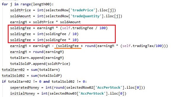그리고 나서 다음으로 역시나 초기 자본금이 매도로 인해서 변했을 경우 이 변동을 기록해야 하는 과정에 들어가야 하는데, 여기서도 역시나 위 스크린샷에서 볼 수 있는 것처럼, 일단 수수료를 절사해 주도록 하고, 이것만 어떻게 반영하도록 합니다.