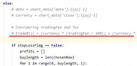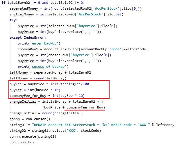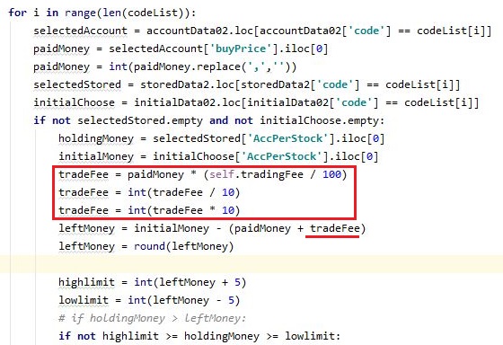 그리고 나서 다음으로 역시나 초기 자본금이 매도로 인해서 변했을 경우 이 변동을 기록해야 하는 과정에 들어가야 하는데, 여기서도 역시나 위 스크린샷에서 볼 수 있는 것처럼, 일단 수수료를 절사해 주도록 하고, 이것만 어떻게 반영하도록 합니다.