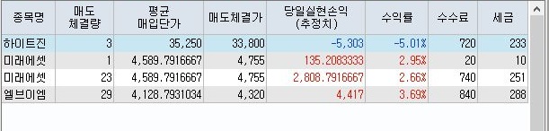 한참을 기다린 끝에 보유하고 있는 종목 하나를 매도하는 데 성공했습니다. 일단 이 종목에 대해서는 이익이냐 손해냐를 따져 봐야 합니다.