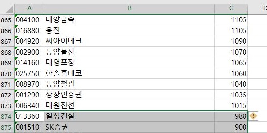 이렇게 해서 일단 일련의 제거가 끝이 났지만, 그래도 여전히 많은 종목이 남아 있습니다. 이제 현재가가 낮은 종목 - 모의투자에서는 거래도 안되는 1000원 미만인 종목들에 대해서 일단 제거에 들어가 봐야 합니다.