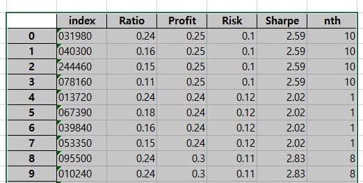 이렇게 해서 종합적인 결과를 얻는데 성공했습니다. 이렇게 결과를 얻었으니, 이제 샤프지수에 따라서 한번 걸러내는 작업에 들어가 보도록 합니다.