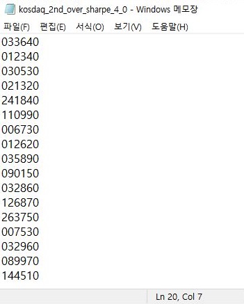 이렇게 해서 샤프지수 4이상만 걸러냈는데도 불구하고 이번에는 20개나 되는 종목이 나오는 것을 확인할 수 있었습니다. 이래서야 이걸 어떻게 쓸 수 있을지 모르겠습니다만, 아무튼 상황이 좋지는 않아 보입니다.