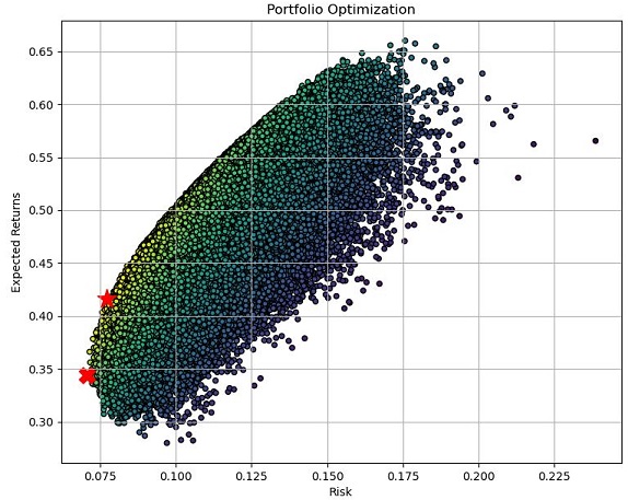 일단 8개의 종목으로 해서 나온 결과입니다. 일단 200만개의 경우의 수를 이용해서 효율적 투자선을 구축하기는 했는데, 어째 너무 점이 빡빡한개 아닌가 하는 느낌도 듭니다.