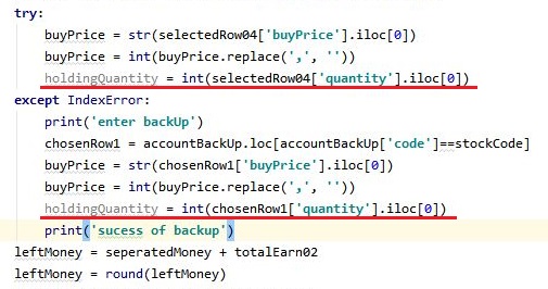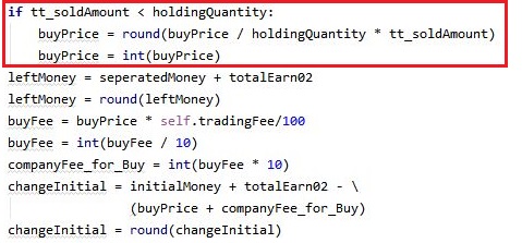 그리고 나서 숫자를 계산해서, 만약 팔았는 숫자보다 보유한 주식의 숫자가 많다 = 보유한 주식의 극히 일부만 팔린 경우에는 매수가격을 풀로 계산할 필요가 없기는 없습니다. 그래서 비율대로 줄려서 한번 계산활 수 있도록 바꾸어 주었습니다.