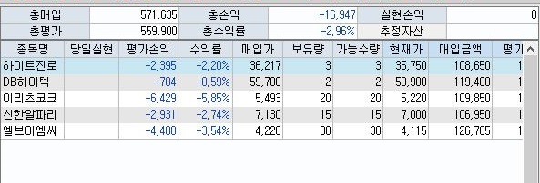 일단 여기서 지금까지 보유한 주식의 내용입니다. 여기서 처분만을 위해서 움직일 수도 있지만, 그래도 새로 선별된 종목들이 얼마나 잘 움직여 줄지 궁금하기 때문에, 그냥 여기까지만 해서 없애기로 했습니다.