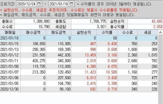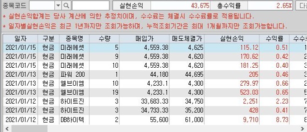 그리고 모든 기간을 다 종합해서 한번 알아본 결과, 일단 위 스크린샷에서 볼 수 있는 것처럼 총 43665원의 이익을 거두었습니다. 이 정도면 지금 당장 남은 주식을 처분해도, 상당한 이익을 남기는 - 애초에 단타로 이익을 남기지 못하게 막아둔 구조에서 낼 수 있습니다.