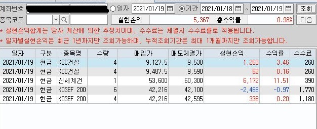 그리고 나서 막 시작한 - 2021년 1월 18일 부터 한번 얼마나 수익이 나왔는지 보는 것인데, 일단 총 실현손익에서............ 벌써 5000원을 넘고 있습니다. 물론 이게 미미할 수 있기는 있지만, 그래도 아예 단타로 이익을 낼 수 없게 되어 있는 환경에서 이만한 수익을 올린 것 자체만으로도 얼마나 대단한데, 종목을 효율적 투자선으로 구축해서 하니, 그 결과가 더 올라간 듯 합니다.