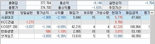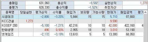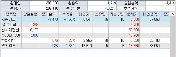 그런데 신세계 건설의 경우 등이 정말 많은 수익을 내 준 것을 확인할 수 있었습니다. 일단 KOSEF 200에서 난 손실을 다 메우고도 4000원이 넘는 수익을 올리고 있는 것을 확인할 수 있습니다.