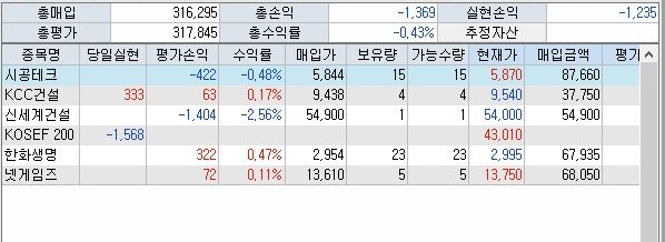그래도 어제 워낙에 많은 수익을 내서 전체적으로는 아직도 수익이 나는 쪽으로 유지 중이기는 합니다만, 종목 선정 과정 자체에 대해서 다시한번 생각해 봐야 할듯 합니다.