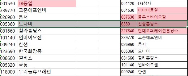 실제로 이런 간극을 어떻게 설명해야 할지 처음에는 몰랐습니다. 그래서 일단은 엑셀의 고유값을 비교해서 표시해 주는 기능을 통해서 한번 종목부터 특정해 보고자 했습니다.