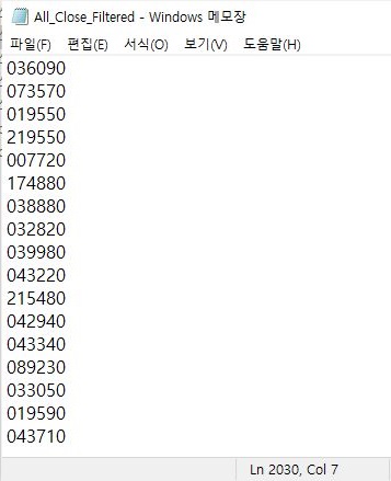 우선 위 스클니샷과 같이 코스피와 코스닥을 모두 모아서 2030개의 종목에 대해서 일단 작업을 해 보도록 합니다. 이게 얼마나 시간이 걸릴지는 모릅니다.