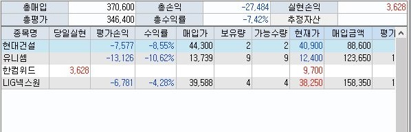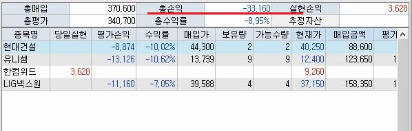 그리고 나서 일단 나온 결과를 보면, 장이 전체적으로 하락장이라서 그런지 소지하고 있는 주식의 가치 하락으로 손해가 3만 3천원이 나왔습니다.