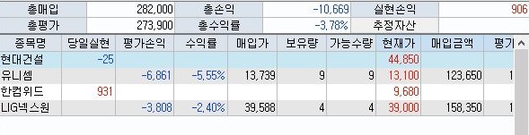 우선 한컴워드는 수익을 내는데 성공했지만, 현대건설에서 손해를 약간 보았습니다. 그래도 이 주식을 이렇게 처분했고, 손해가 엄청나게 작다는 점에서 만족해야 할지도 모르겠습니다.