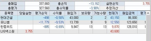 일단 전체적으로 주식을 매수하고 나서 가격이 내려간 것을 확인할 수 있었습니다. 특히 유니셈은 정말 죽어라 매입가를 넘지 못하고 있는 죽쓰는 상황을 볼 수 있었습니다.