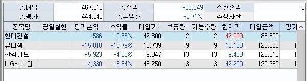 다만, 보유하고 있는 주식의 가치는 계속해서 내려가서, 이래저래 아무것도 하지않은 채로 일이 끝나는 - 상황이 악화만 되는 것을 확인할 수 있기는 있었습니다. 이대로 손절매가 일어나는 것인지 아닌지에 대해서 한번 확인을 해 보아야 하는 생각이 듭니다.
