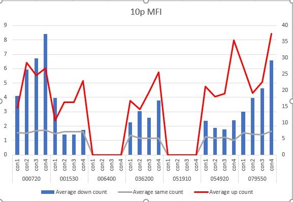 역시나 보조축의 눈금 단위를 보시면, 너무 커서 나머지 횟수는 다 가려지는 효과를 보여주고 있습니다. 즉, 지금 현재 사용하고 있는 MFI지수도 그렇게 까지 좋은 방법은 아니라는 말이 나옵니다.