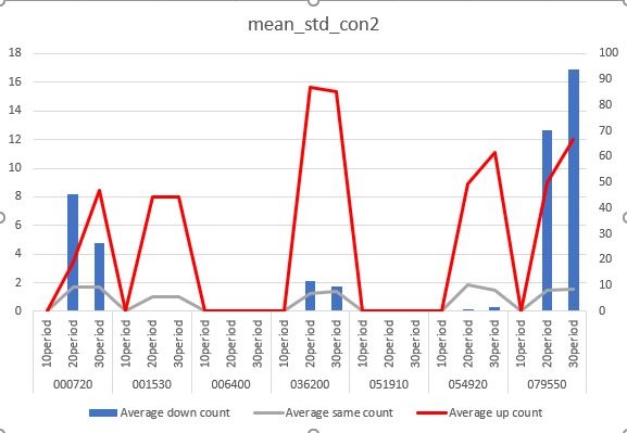 그 다음으로 표준편차에 2배수를 곱해주는 조건인데, 여기서도 그렇게 특별한 패턴은 없어 보이기는 합니다. 단지 종목별로 다른 결과가 나오는 것을 볼 수 있었습니다만, 일단 여기서 포스팅을 한번 끊도록 하며, 나머지 내용은 다음 포스팅에서 다루어야 하는데, 무언가..... 제 예상과는 다른 방향으로 흘러가는 듯 합니다.