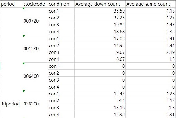 그래거 각각의 컨디션 별로 종목들을 묵었고, 그 종목들은 period별로 각각의 결과를 알아볼 수 있도록, 엑셀의 정렬 기능을 사용해야 했습니다. 먼저 stockcode를 1차로 올림차순하고, 그 다음에 condition별로 2차 기준으로 올림차순 해 주도록 합니다.