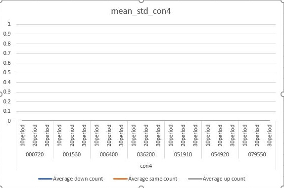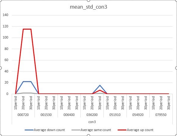 이동평균선을 사용한 다음의 계산에서, 여기서는 특이점이 나온 것이 어째서 매수이후에 상승한 정도가 더 크고, 하락한 경우는 거의 없는 것으로 나옵니다. 다만, 거래도 거의 일어나지 않는 상황임은 정말 유의해야 합니다.