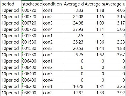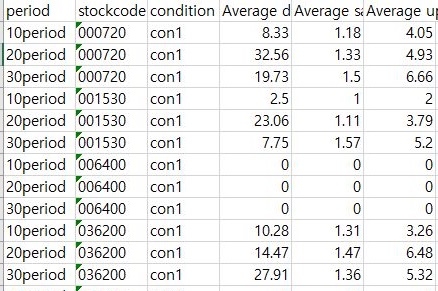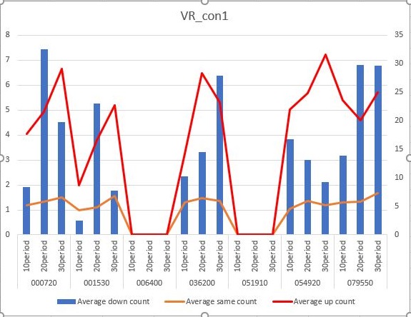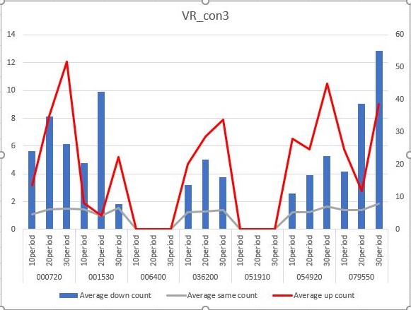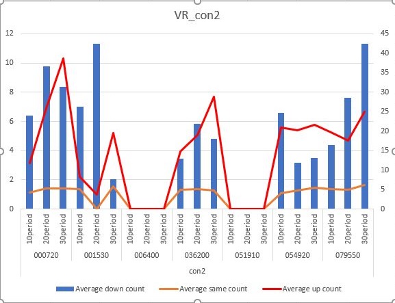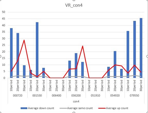 그래서 VR지수를 기본으로 해서 나오는 결과를 두고서, 위 스크린샷을 보시면 알 수 있듯이, 일단은 어느정도 30period로 가면 매수 이후 감소하는 경우가 적다 = 제대로 저점을 잡은 것으로 보이나, 종목에 따라서는 아닌 경우도 나오고 있습니다.