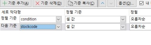 이제 엑셀에 있는 정렬 기능을 사용해서, 위 스크린샷에서 볼 수 있는 것처럼 첫번째 기준으로는 condition을 기준으로 하고, 다음으로는 stockcode를 기준으로 해서 정렬해 보도록 합니다.