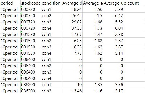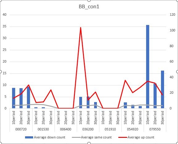 이렇게 해서 가장 널널한 조건인 볼린져 밴드에서 나온 결과인데, 일단 여기서는 대체적으로 period가 늘어나면 늘어날 수록 일단 매수 이후 감소하는 경우는 적어지는 듯 합니다. 다만 이것도 모든 종목이 다 그러는 것이 아니라 예외인 상황도 있다는 것이 문제라면 문제입니다.