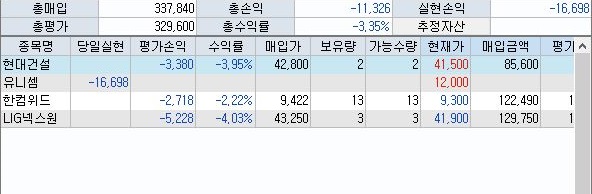 우선 전체적으로 실현손익이 이익을 보는 것에서 천원 정도 손해를 보는 것으로 바뀌었지만, 그렇게 크게 샌경은 쓰지 않도록 해야 할듯 합니다.