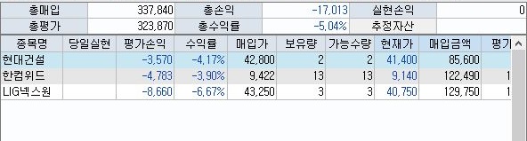 오히려 보유하고 있는 주식의 가치는 더 떨어져서 손해를 더 키우는 원동력이 되고 있었습니다. 이래서야 이걸 가지고서 무엇을 더 할 수 있는지 모르겠습니다만, 일단 이번 종목 선정은 그렇게 성공적이지 않다는 생각이 듭니다. 그리고 이를 바탕으로 해서 나온 결과도 당연히 그렇게 성공적이지 않은 듯 하고요.