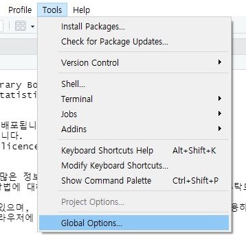 일단 모든 인스톨이 끝이 나서, 한번 R studio를 실행시켜 보도록 합니다. 그리고 나서 여기서 나오는 것을 가지고서 위 스크린샷처럼 Tools 항목에 있는 Global Options를 선택하도록 합니다.