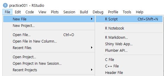 파일 메뉴에 있는 New file을 이용해서 사용하기 위한 R 스크립트를 우선 생성해 보도록 합니다. 이제까지 파이참만 써와서 그런지 상당히 낯설게 느껴집니다.
