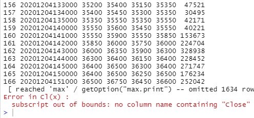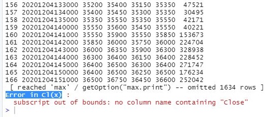 위 스크린샷에서 보면 알 수 있듯이 일단은 대문자로 바꾸었지만, close만 추출하는 함수인 Cl()은 제대로 작동을 하지 않는다는 것 입니다. 나중에 안 사실이지만, 이건 야후 데이터 베이스, 정확히는 getSymbols라는 함수로 얻어온 데이터 유형에만 적합하다는 것을 알 수 있었습니다.