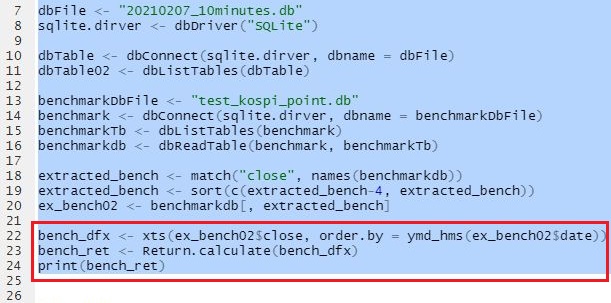 일단 이런들 저런들 지난번에 kospi의 기준이 되는 종목에 대해서 일단 xts로 변환까지 해 주어서 제대로 수익률을 계산할 수 있도록 만들어 줍니다.