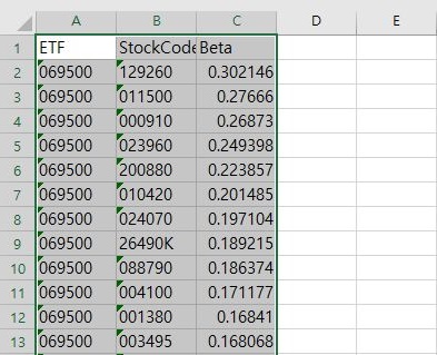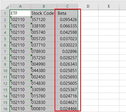 일단 지난번 포스팅에서 언급한 대로 어떻게 베타를 계산한 다음에, 이를 위 스크린샷에서 볼 수 있는 것처럼, 어떻게 나와서, 이를 엑셀 파일에서 열었습니다.
